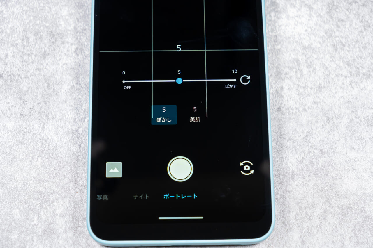AQUOS wish5のポートレートモードは物でも利用できますが、元々人物撮影をメインに設計されており、撮影画面からぼかし具合と美肌補正を調整することができます。