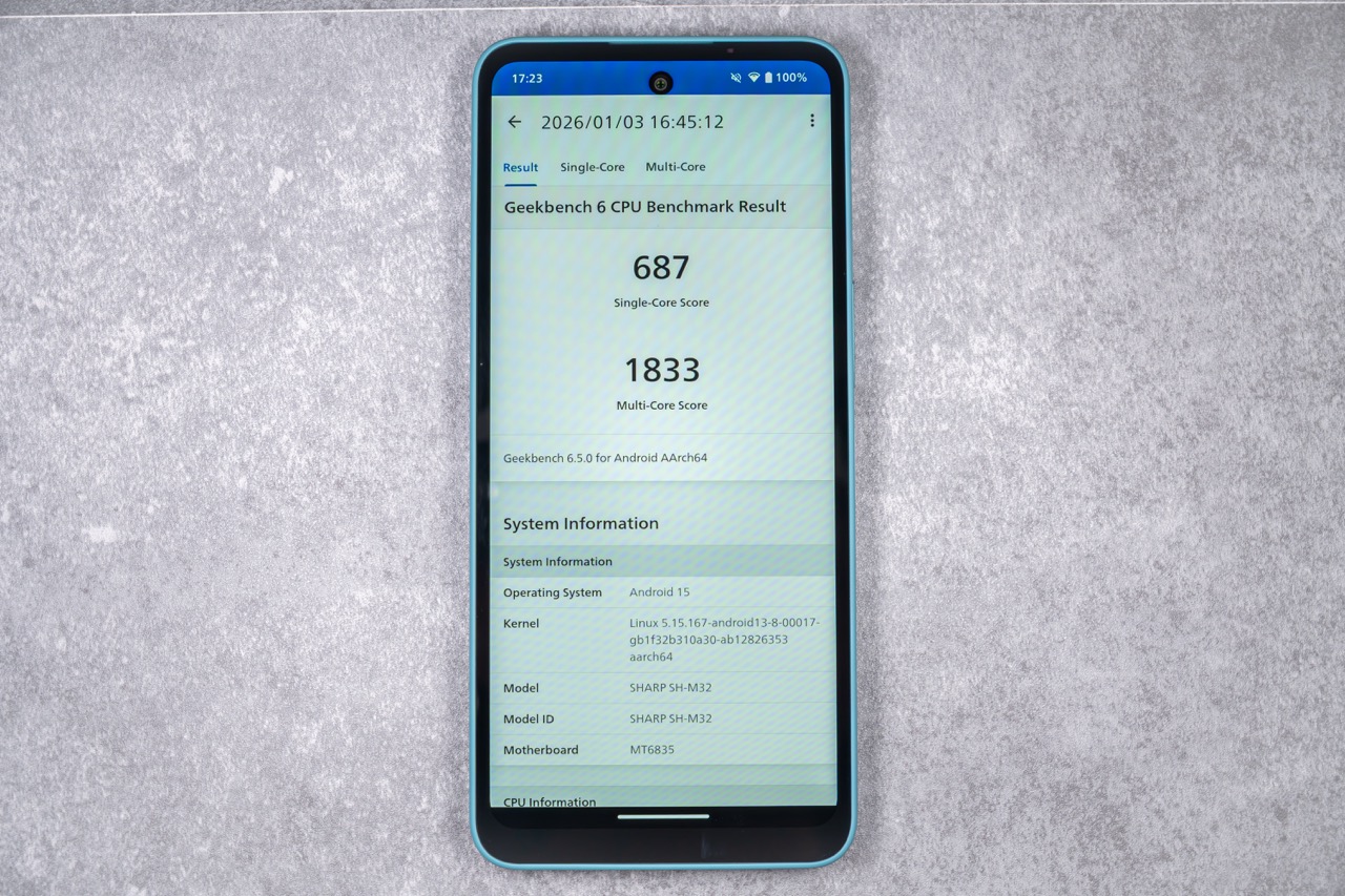 - Geekbench6:シングル687、マルチ1,833