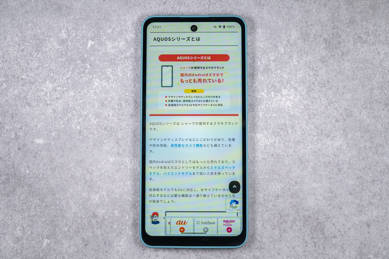 AQUOS wish5のディスプレイは、解像度や発色、リフレッシュレートは問題ありませんが、明るさには物足りなさを感じてしまいました。